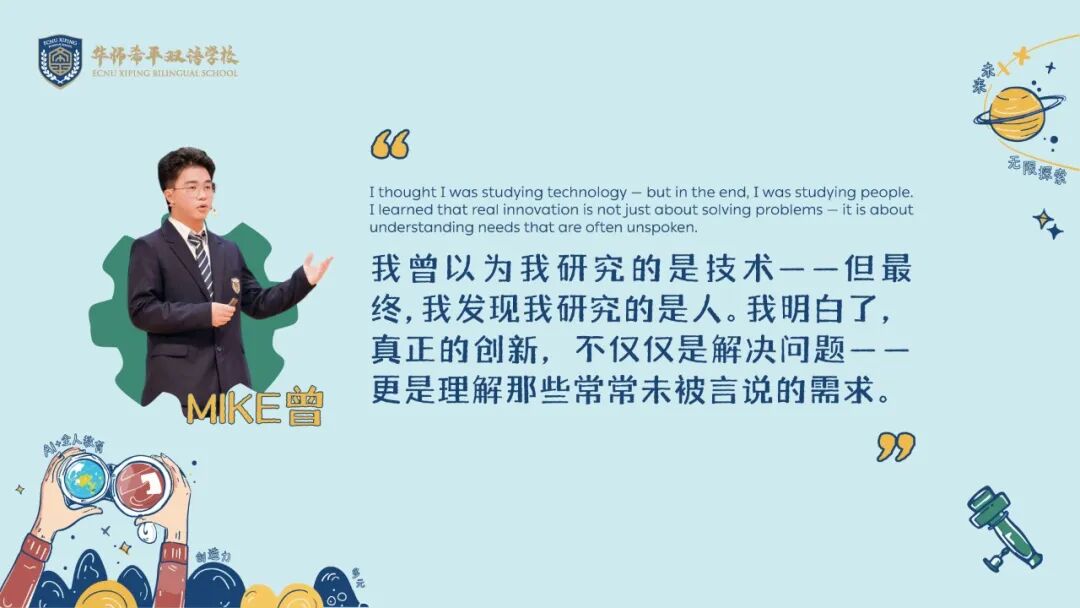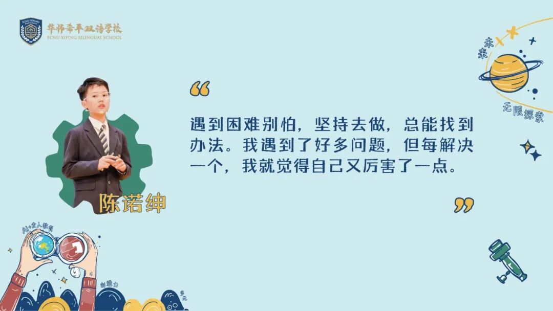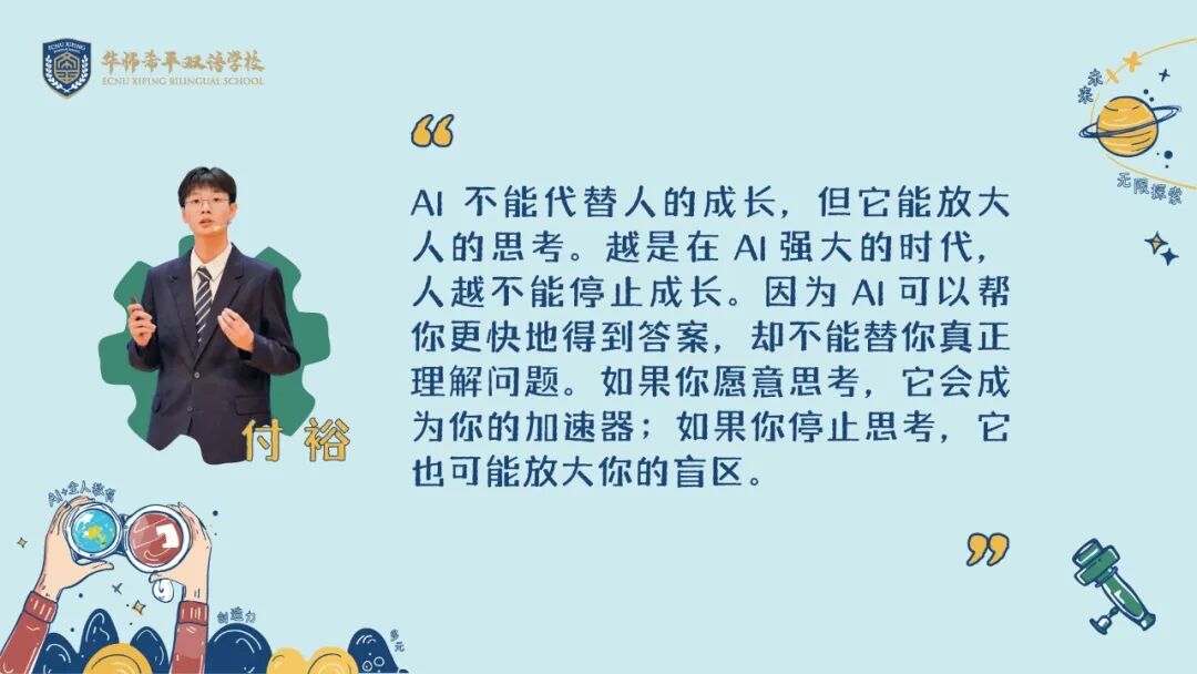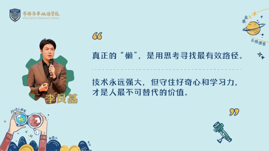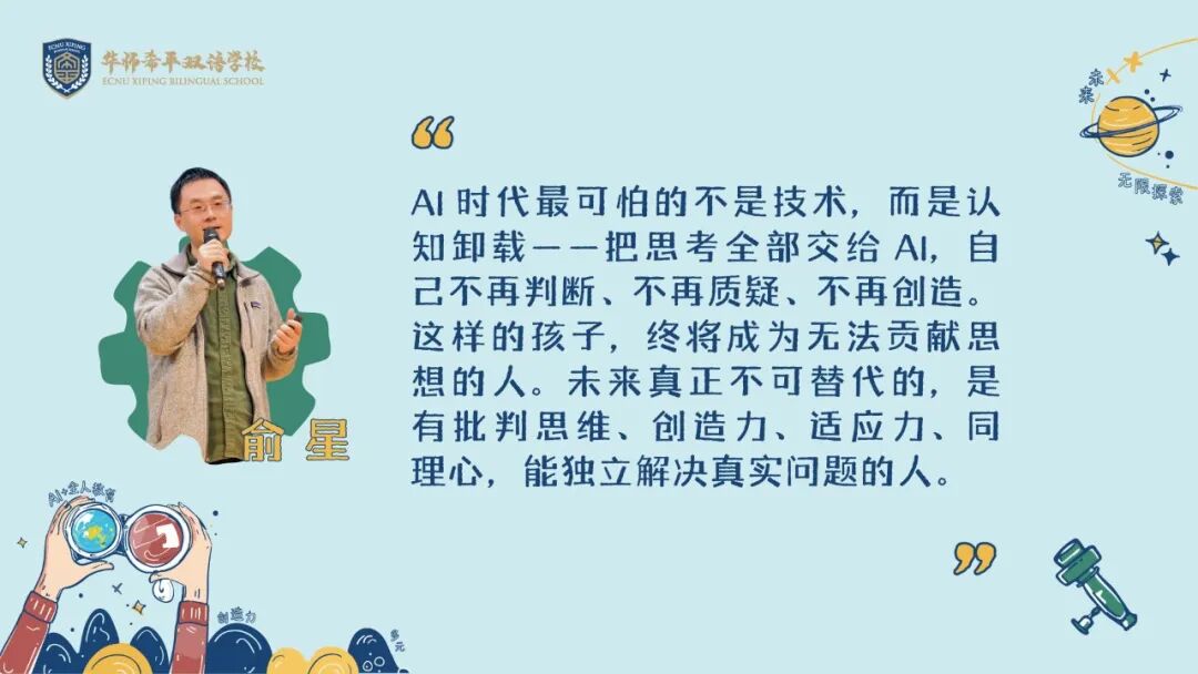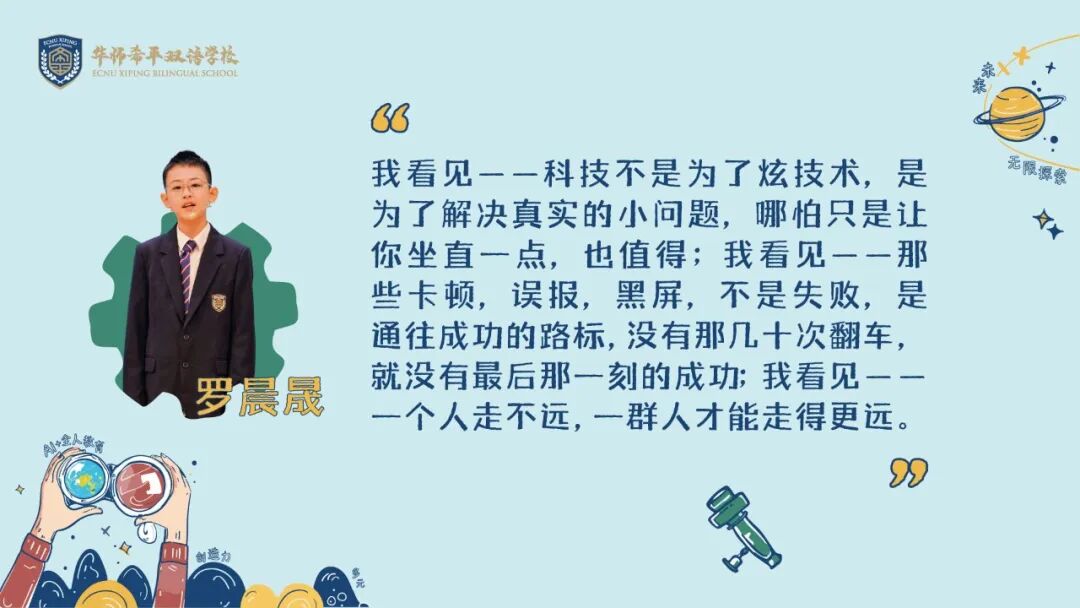 他们用代码编织未来,用创造回应时代,而华师希平双语学校,将继续做他们精神星空的守夜人,以育人的初心为罗盘,在人工智能的浪潮中,陪伴每一位学子驶向破晓的晨曦。