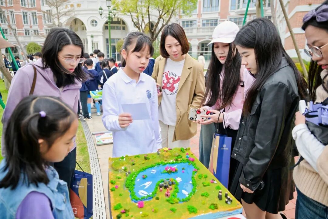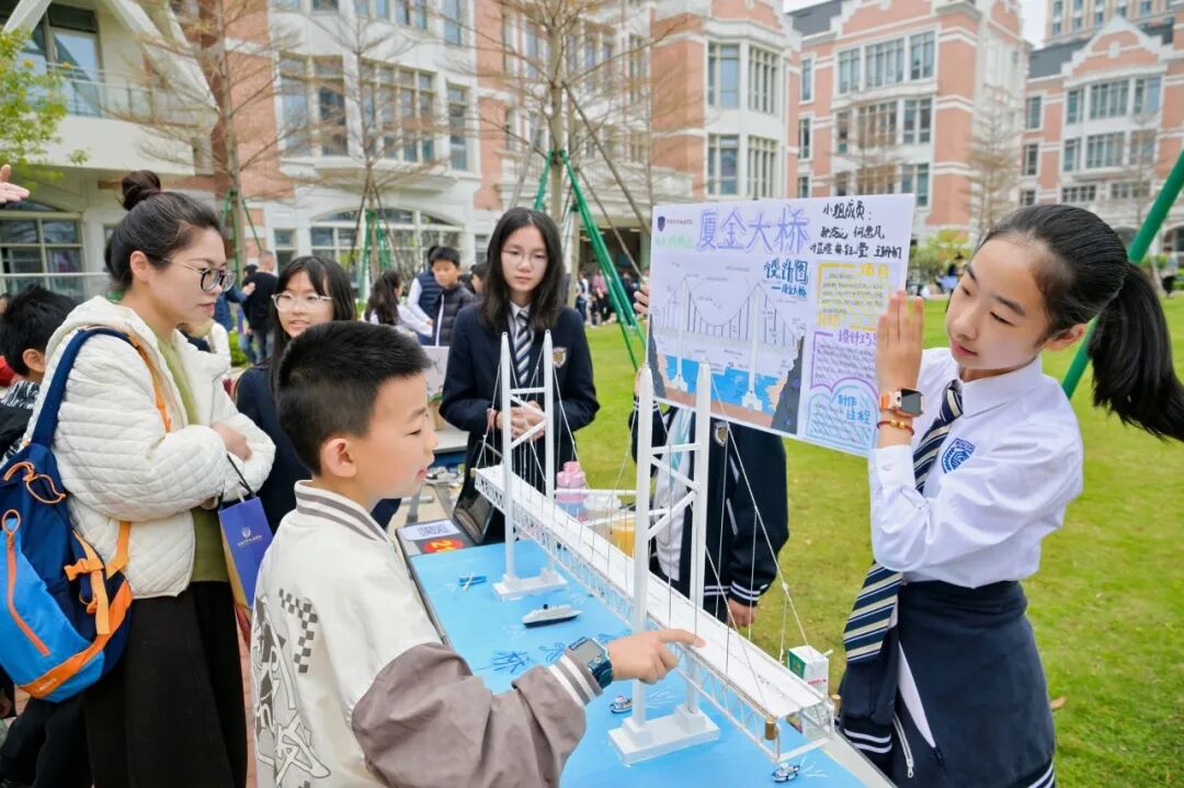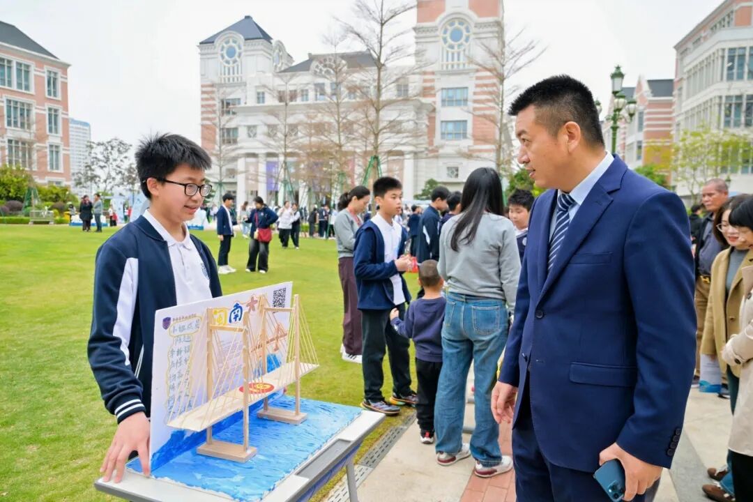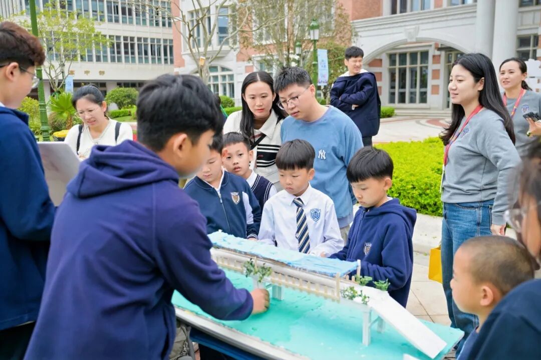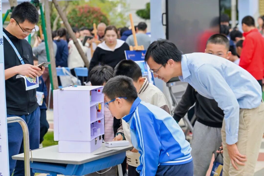 内场思想激荡,外场科创嘉年华同样高潮迭起。中央草坪上,上百件学生原创科创作品集中亮相 —— 垃圾智能转运系统、水火箭、AI 智能台灯、多传感器交互式智能家居、墨子照相机、智能快递柜顶棚、智能推拉窗、3D 打印、桥梁模型等创意纷呈,更有多项省市科创大赛获奖作品惊艳展出。同学们化身小小讲解员,以自信从容的姿态、专业清晰的表达,向来宾细致讲解创作思路与实践过程。