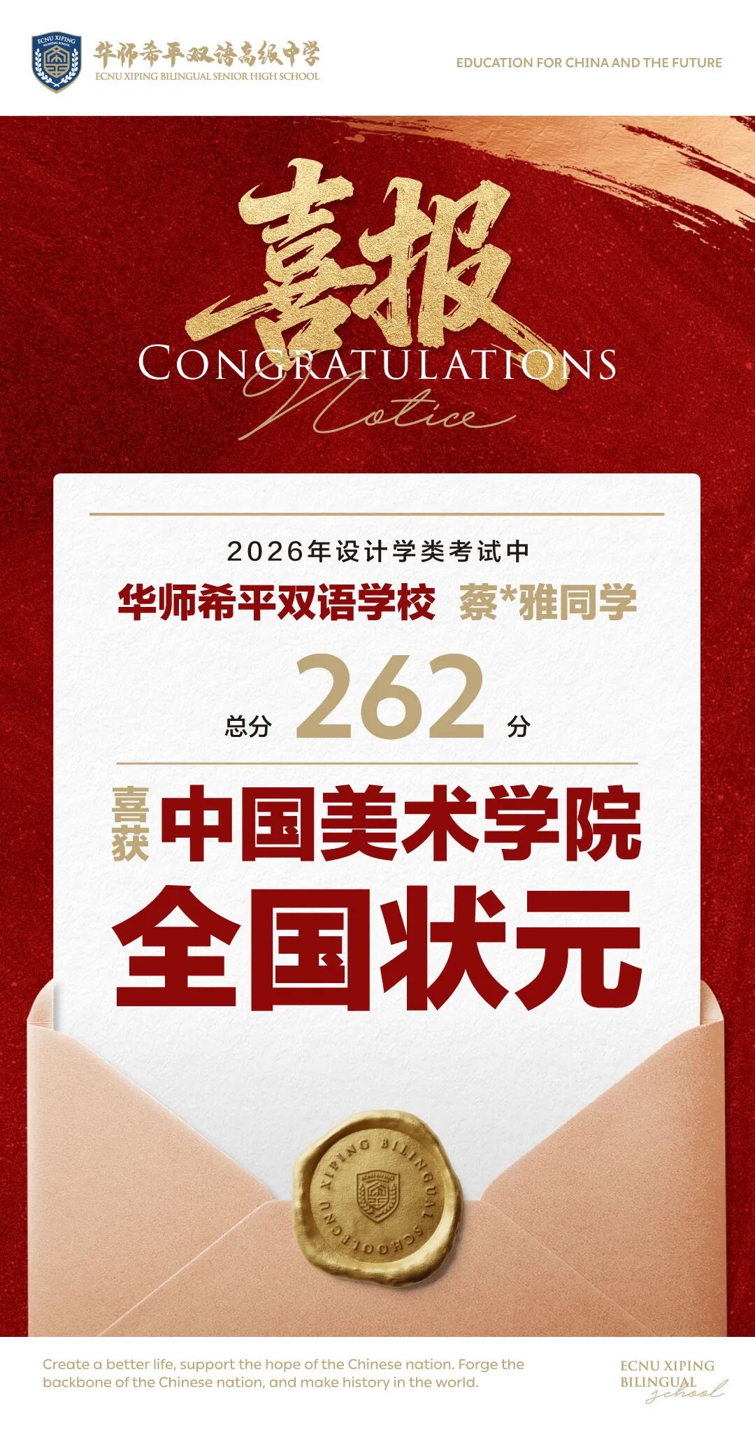 近日,华师希平双语学校再传艺考捷报!蔡筱雅同学凭借扎实功底与卓越创意,一举拿下中国美术学院设计类全国状元,同时获四川美术学院破格录取,用实力书写了华希艺术教育的高光时刻。